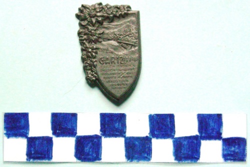 A forma di scudo decorato da stelle alpine sui lati superiore e sinistro. Al centro, in rilievo un paesaggio alpino con abeti ed in primo piano un reticolato. Iscrizione nella parte inferiore.