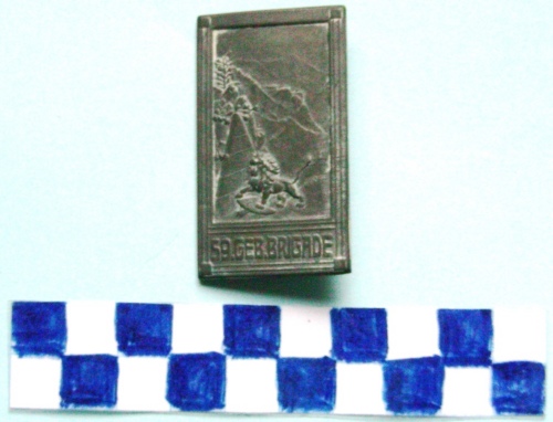 Di forma rettangolare. Al centro in rilievo, un leone ruggente che calpesta uno scudo, rivolto verso un muro triangolare. Sullo sfondo un paesaggio montano. Alla base iscrizione in rettangolo. Sul verso spilla di fissaggio ed iscrizione.