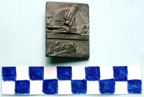Di forma rettangolare, suddivisa in tre parti. Quella centrale costituita da una fascia con iscrizione. In quella superiore, in rilievo un mortaio con sottostante disco. In quella inferiore, in rilievo un cannone circondato da un gruppo di serventi. Sul verso spilla di fissaggio.