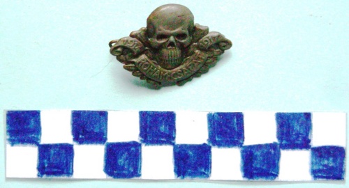A forma di spilla con treschio in rilievo e sottostante cartiglio con iscrizione. Sul verso spilla di fissaggio.