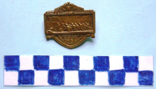 Di forme rettangolare a coprire parzialmente uno scudo che reca nella parte superiore un'aquila bicipite con ali molto allungate e nella parte inferiore delle iscrizione tra decorazioni a motivi floreali. Nel rettangolo, in rilievo, un gruppo di soldati con il fucile spianato che caricano verso sinistra agli ordini di un ufficiale con la spada sguainata. In secondo piano un paesaggio montano con alberi. Iscrizioni lungo il perimetro. Sul verso spilla di fissaggio ed iscrizione.
