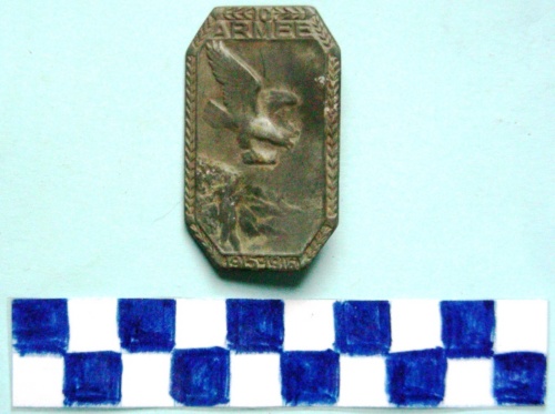 A forma ottagonale decorata con rami d'alloro. Al centro, in rilievo aquila in volo verso destra su paesaggio montano. Iscrizioni sui lati inferiore e superiore. Sul verso, spilla di fissaggio ed ulteriore iscrizione.