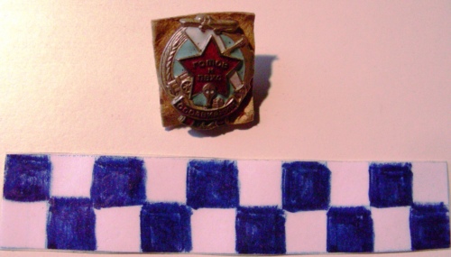Distintivo smaltato, corona divisa in tre settori, a sinistra un ramo d'alloro, a destra una corona dentata, nella parte inferiore un cartiglio di colore rosso con iscrizione, con sovrapposta, al centro, una testa di cobra e coda a sonagli. Al centro disco smaltato di colore azzurro con sovrastanti, a sinistra un cannone della contraerea che incrocia un fascio di luce generato da una fotoelettrica a destra che inquadra un bombardiere nella parte superiore sinistra. Sopra tutto una stella di colore rosso a cinque punte con iscrizione. Sul verso una vite e disco avvitabile di fissaggio, sul retro del disco un'elica stilizzata ed iscrizione in cirillico.