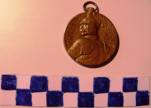 Disco dorato, sul dritto, in rilievo, il profilo di Milosh Obilich con corazza ed elmo sormontato da drago, iscrizione lungo la corona. Sul verso croce patente con sovrastanti due spade incrociate e corona d'alloro con iscrizione all'interno.