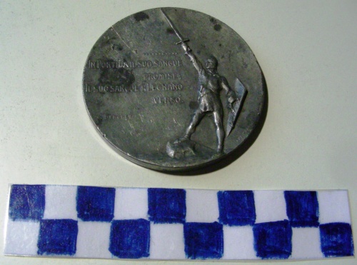 Di forma circolare. Sul recto, al centro, in rilievo figura di Alberto da Giussano con scudo e spada sguainata sopra la testa. Iscrizione a sinistra della figura e lungo la corona alla destra. Sul verso, in rilievo, scena con buoi che trainano il carroccio verso sinistra. A destra, cavaliere a cavallo di spalle. Iscrizioni in esergo.