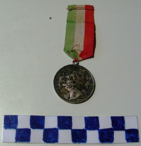 Di forma circolare. Sul recto, al centro, in rilievo busto accollato a sinistra di Umberto I. Iscrizioni ai lati. Sul verso iscrizioni entro corona d'alloro. Nastrino tricolore.