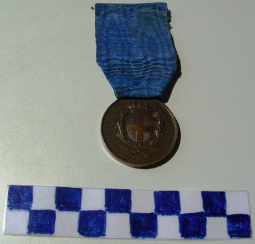 Di forma circolare. Sul recto, al centro, stemma Savoia coronato tra rami di alloro legati da nastro. Iscrizioni lungo la corona e sotto la figura. Sul verso, rami di alloro legati da nastro. Nastrino blu.
