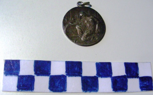 Di forma circolare. Sul recto, al centro in rilievo, due soldati degli eserciti piemontese e francese con le destre unite, sull'asta di un vessillo. Iscrizione lungo la corona e nella parte inferiore. Sul verso, figura allegorica femminile inginocchiata di fronte ad una lapide, nell'atto di deporre un ramo di palma. In secondo piano tra gli alberi la rocca di Solferino e la torre di San Martino della Battaglia. Iscrizione sulla lapide. Anello all'appiccagnolo.