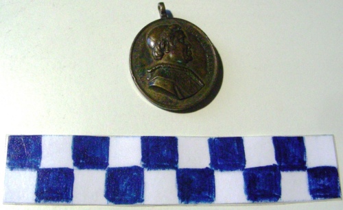 Di forma ovale. Sul recto, al centro in rilievo, busto accollato a destra di Pio IX con berretto, mozzetta e stola. Iscrizione lungo la corona. Sul verso, al centro, in rilievo, busto di tre quarti a sinistra di San Pietro con le chiavi. Iscrizione lungo la corona .