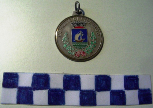 Disco di metallo zigrinato. Sul dritto, al centro uno scudo d'azzurro alla barca al naturale su acque di verde ondate d'argento ad un tronco d'albero radicato, nascente dalla barca, nodoso di tre pezzi, il superiore a a destra fogliato di tre, il tutto al naturale, alla vela bianca, gonfia verso sinistra, appoggiante al tronco. Lo scudo sarà sormontato dalla speciale corona del comune. lo scudo è circondato da un ramo d'alloro ed uno di quercia legati alla base da fiocco rosso. Iscrizione sulla parte superiore della corona. Iscrizione sul verso. Anello all'appiccagnolo.