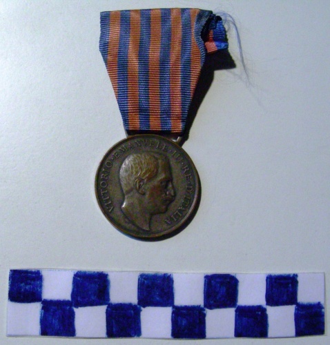 Di forma circolare. Sul recto, al centro in rilievo, busto accollato a destra di Vittorio Emanuele III. Iscrizione lungo la corona. Sotto il collo monogramma illeggibile. Sul verso, iscrizione entro rami d'alloro stretti da nastro. Nastrino da sei strisce blu alternate a cinque strisce rosso scuro.
