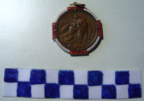 Di forma circolare inserita in una montatura circolare di smalto bianco decorata in oro con quattro rettangoli smaltati in rosso e decorazioni geometriche in oro. Sul recto, al centro, in rilievo, entro cerchio perlinato, figura allegorica femminile, velata, nell'atto di soccorrere un ferito. Sullo sfondo, un gruppo di soldati in azione a sinistra e cannone sulla destra. Iscrizione lungo la corona e nella parte inferiore. Sul verso, in perlinato , croce smaltata in rosso in campo bianco racchiusa in un rettangolo ornata da rami d'alloro. Ai lati, baionette incrociate. Iscrizione nella parte inferiore. Anello all'appiccagnolo.