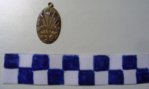 Di forma ovale. Sul recto, cinque bandiere smaltate della Russia, Francia, Italia, Regno Unito e Belgio, con aste incrociate avvolte da nastro recante iscrizione azzurra. Appiccagnolo.