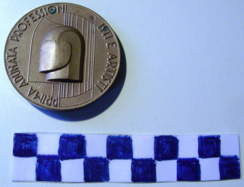 - ISCRIZIONI sul recto, lungo la corona - PRIMA ADUNATA PROFESSIONISTI E ARTISTI - caratteri alfanumerici - a incisione -