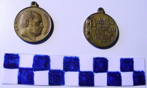 Di forma circolare. Sul recto, in rilievo, busto accollato a destra di Mussolini. Iscrizioni lungo la corona e sotto la figura. Sul verso, a sinistra, in rilievo, fascio littorio a destra avvolto da ramo d'alloro. Iscrizione al centro.