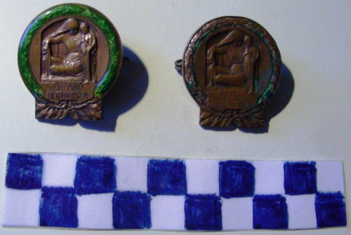 Di forma circolare. Sul recto, entro corona d'alloro di colore verde, una figura di donna velata, seduta, che regge il velo con il braccio destro spiegato ed una figura di bimbo in piedi alla sua sinistra. Iscrizione sottostante e due rami d'alloro incrociati alla base. Sul verso, spilla di fissaggio ed iscrizione.