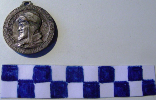 Di forma circolare. Sul recto, al centro, in rilievo, busto accollato a sinistra di un aviatore con casco ed occhiali. Iscrizioni lungo la corona e a sinistra della figura. Sul verso, al centro, in rilievo tre idrovolanti in volo a sinistra, sopra l'Oceano. Nella parte inferiore un fascio littorio a destra ed iscrizione.