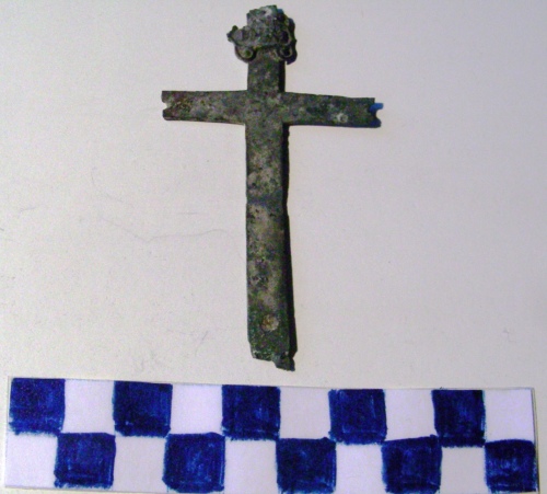 A forma di croce latina con cartiglio con iscrizione illeggibile sul braccio superiore.