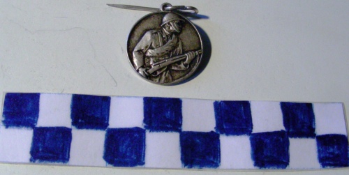 Di forma circolare. Sul recto, al centro, in rilievo busto a destra di un soldato con fucile Mod. 91 ed elmetto Adrian. Sul verso, al centro, iscrizione.