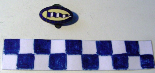 Di forma ovale. Sul recto corona di colore blu con iscrizione dorata. Al centro, in campo giallo, asta dorata con fiamma a destra e quattro strrisce blu e quattro bianche alternate. Sul verso, fermaglio a forma di goccia rovesciata ed iscrizione.