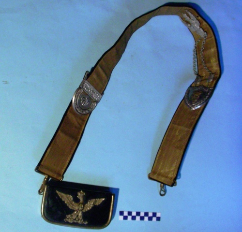 Larga fascia in tessuto dorato, al verso di velluto nero, con importante stemma in rilievo applicato al centro e terminante con due magliette e moschettoni dorati per il fissaggio agli anelli di una gibernetta. Grande fibbia metallica per la regolazione a forma di valva ed un passante, il tutto decorato a motivi floreali in rilievo. Gibernetta a forma di parallelepipedo nero con profilature e facce laterali dorate; chiusura a ribalta tramite asola ad incastro in un perno fissato alla base. Stemma in rilievo applicato al centro della ribalta.