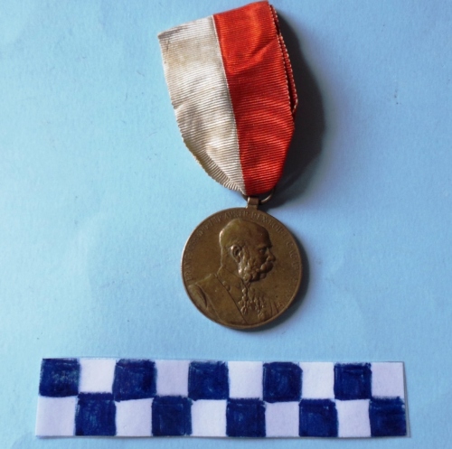 Di forma circolare. Sul recto al centro, in rilievo busto a destra in grande uniforme dell'imperatore. Iscrizioni sulla corona. Sul verso al centro, in rilievo iscrizione in rettangolo circondata da rami di quercia e d'alloro, stretti da nastro. Ulteriore iscrizione lungo la corona. Nastrino bipartito bianco e rosso.