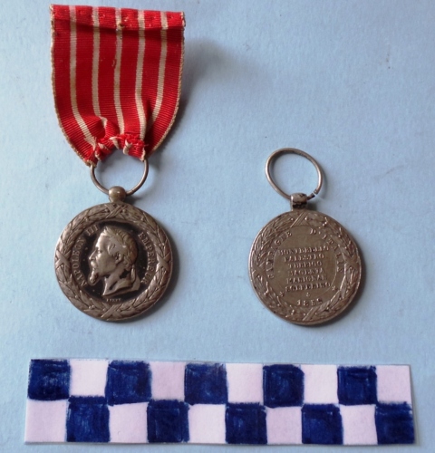 Di forma circolare. Sul recto, al centro, in rilievo busto laureato e accollato a sinistra di Napoleone III entro corona d'alloro. Iscrizioni lungo la corona e sotto la figura. Sul verso, al centro, in rilievo iscrizione entro corona d'alloro. Ulteriore iscrizione lungo la corona. Anello all'appiccagnolo. Nastrino con cinque strisce bianche in campo rosso.