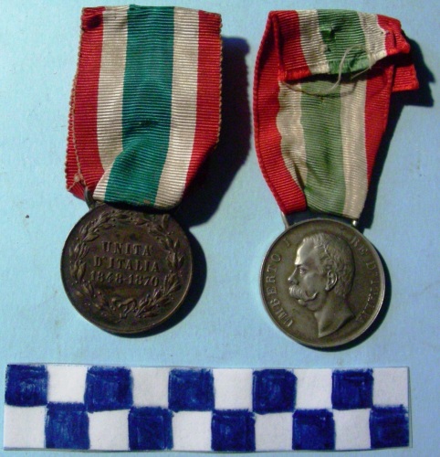 Di forma circolare. Sul recto, al centro, in rilievo, busto accollato a sinistra di Umberto I re d' Italia. Iscrizione lungo la corona. Sul verso, al centro, in rilievo, iscrizione circondata da rami d'alloro legati da nastro. Anello all'appiccagnolo con nastrino tricolore.