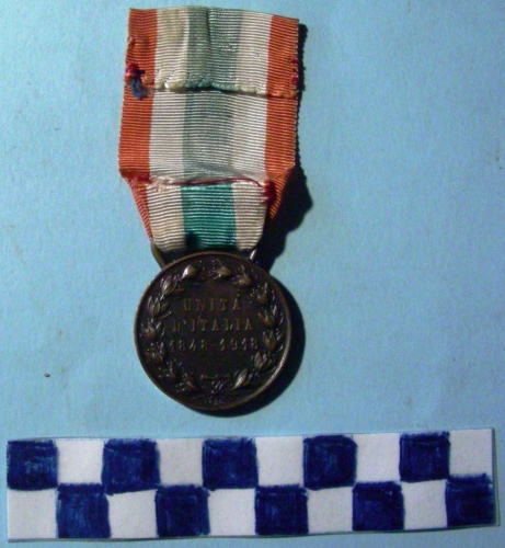 Di forma circolare. Sul recto, al centro, in rilievo, busto accollato a sinistra di Vittorio Emanuele III. Iscrizione lungo la corona. Ulteriori iscrizioni sotto il busto. Sul verso, al centro, in rilievo, iscrizione circondata da rami d'alloro legati da nastro. Ulteriore iscrizione sotto il nastro. Anello all'appiccagnolo con nastrino tricolore.