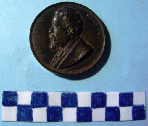 Di forma circolare. Sul recto, al centro, in rilievo busto accollato a sinistra di Benedetto Cairoli. Iscrizioni lungo la corona e sotto la figura. Sul verso, sotto stella raggiante a cinque punte in tondo, rami di quercia e d'alloro stretti da nastro con iscrizioni. Ulteriori iscrizioni al centro e attorno ai raggi della stella.