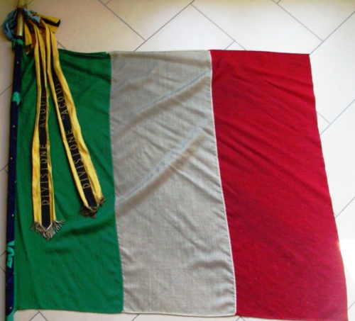 Tricolore nazionale con quattro fettucce di colore verde, sul lato corto, per il fissaggio al pennone. Freccia dorata con scudo sabaudo su un basamento a forma di parallelepipedo con quattro magliette alla base che recano appese 5 riproduzioni di medaglie d'oro legate da nastro azzurro ed una fascia con una striscia nera centrale in campo giallo con iscrizione e frange in canottiglia dorata. Il pennone è diviso in due parti ricoperto di blu e decorato con borchie.
