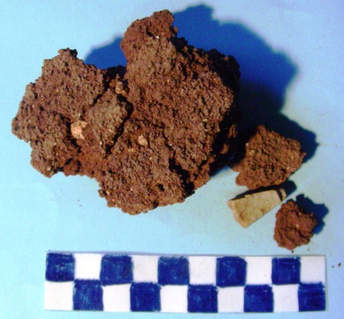 Grumi di terra di colore rossastro con sassi di colore bianco.