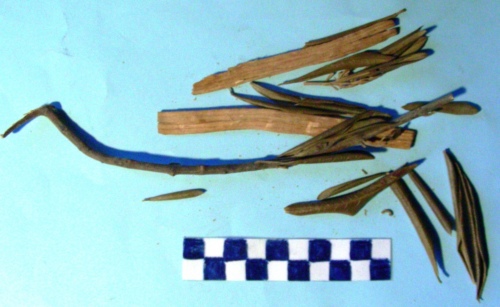 Rametto d'ulivo con foglie rinsecchite e due piccoli frammenti di legno.
