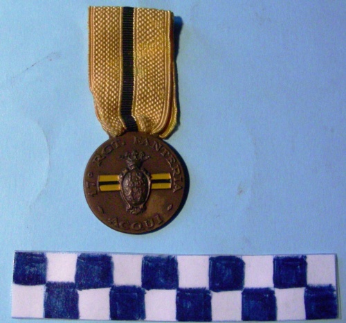 - ISCRIZIONI sul recto, lungo la corona - 17° RGT. FANTERIA - ACQUI - - caratteri alfanumerici - in rilievo - latino