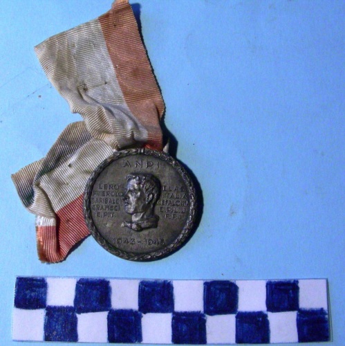 Di forma circolare. Sul recto, al centro, in rilievo, entro corona formata da rami d'alloro e di quercia, legati da nastro, busto maschile accollato a sinistra con fazzoletto al collo. Iscrizioni intorno alla figura. Sul verso, in rilievo, iscrizioni al centro, sotto stella a cinque punte e lungo la corona. Nastrino scolorito con i colori nazionali.