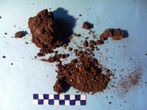 Grumi di terra di colore marrone con punti bianchi.