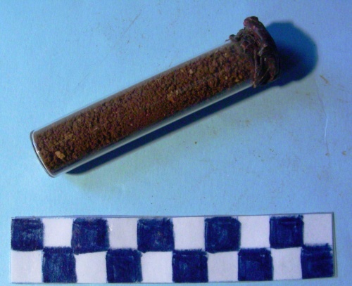 Terra rossiccia contenuta in una fiala sigillata con ceralacca.