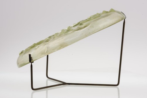 Piatto in vetro incolore circolare con piede ad anello. Il cavetto dalla parte esterna è decorato da quattro riquadri composti da quattro file di altrettante bugne a punta di diamante, alternati a dischi circolari con rilievo centrale, affiancati da due piccoli cerchi appuntiti