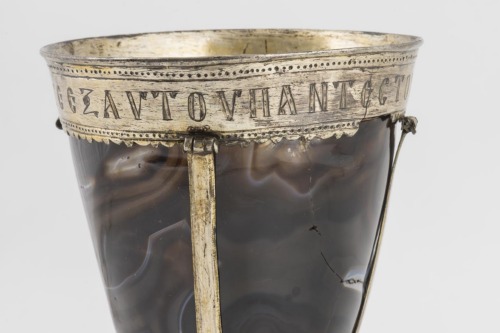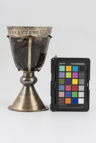 Alta base troncoconica in argento dorato con rigonfiamento anulare all'impostazione della coppa, campaniforme, realizzata in onice-agata. Lungo l'orlo vi è una montatura in argento dorato, con un'iscrizione incisa compresa entro due linee di punti e una fascia inferiore di motivi decorativi semicircolari e a punta. Quattro fascette collegano il piede alla montatura lungo l'orlo