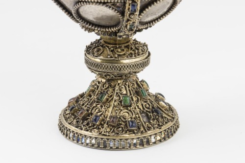 Basso piede troncoconico in argento dorato con grosso rigonfiamento anulare all'impostazione della coppa. La base è suddivisa con filigrana in otto fascette, riempite con un motivo a volute rilevate articolato in una grande spirale al centro, circondata da volute più piccole e irregolari, con tre pietre, verdi sopra e alternativamente rosse e blu sotto. Lungo il diametro del piede vi è una fascia piatta con un decoro ad arcate. Anche il nodo è decorato a filigrana, con un motivo centrale a cordone serpentinato. Alcuni listelli filigranati con pietre verdi e blu fissano il piede alla coppa. Quest'ultima è ornata da una doppia linea di cerchi alternati, profilati da file di grani che si ripetono nelle linee superiori ed inferiori che delimitano questi medaglioni. Lungo l'imboccatura vi sono tre piccole anse piatte e una fascia composta da sei pannelli, di cui ne resta solo uno rifinito a smalto con piccole croci a profilo scalettato, motivo che sopravvive anche in due delle anse