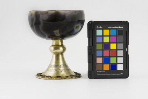 Alta base troncoconica in argento dorato con bordo piatto e ingrossamento anulare verso la coppa. Il bordo del piede è decorato da una fila di cabochons rotondi e rettangolari; al di sopra è incisa una iscrizione. Coppa emisferica di onice; all'interno vi è un medaglione smaltato, fissato con quattro chiodi a testa ineguale, con Cristo benedicente a mezzo busto, contornato da una fila di punti a smalto, con il Vangelo chiuso nella mano sinistra