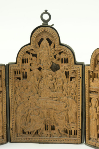 Tavoletta centrale rettangolare con cimasa trilobata. All'interno di una cornice a zig zag che corre lungo il perimetro vi è la rappresentazione della Dormitio Virginis