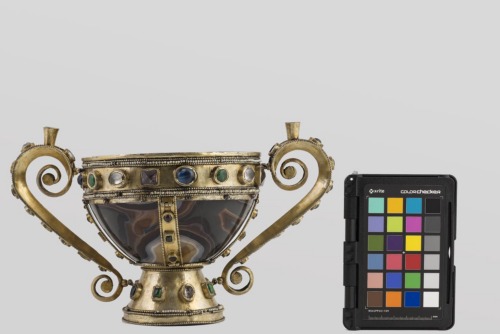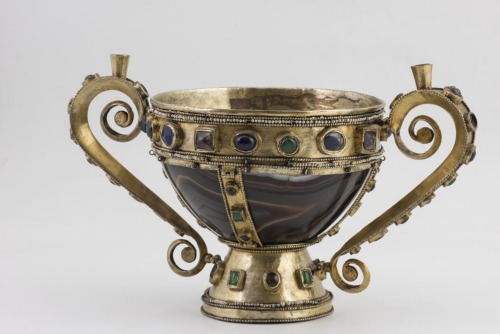 Alto piede troncoconico decorato da linee di granuli e perle e da una fila di cabochons. Coppa emisferica in sardonica, liscia. L'orlo è rifinito da una fascia in argento dorato, profilata nella parte inferiore e superiore da tre linee di granuli e perle; all'interno corre una fila di cabochons. Dodici anellini sono fissati alla parte inferiore della fascia. Montatura di piede ed orlo sono collegate da quattro bande in argento dorato, delimitate da file di granuli e con fila centrale di cabochons. Due anse in argento dorato ad "S" divergenti, con terminazione a voluta, si impostano a metà del piede e dell'orlo; sono decorate come gli altri elementi in argento da cabochons e file di granuli