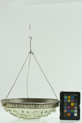 Lampada in vetro incolore con piede ad anello. Cavetto espanso, decorato nella parte inferiore da otto elementi circolari con punta centrale rilevata, e, nella porzione superiore, da altri otto cerchi di dimensioni inferiori alternati a due bugne appuntite. Una fascia in argento dorato con iscrizione incisa rifinisce l'orlo; è decorata superiomente da un motivo fitomorfico e inferiormente da una serie di elementi semicircolari. Tre anelli equidistanti ne permettono la sospensione