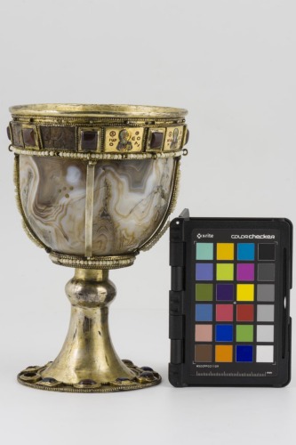 Alto piede troncoconico svasato in argento dorato, con elemento anulare verso la coppa. Il diametro del piede è profilato da una linea di granuli con al centro una fascia di cabochons. Coppa campaniforme in agata, liscia. Tra la base e l'impostazione della coppa vi è un raccordo in argento dorato, profilato da una linea di granuli superiomente e inferiormente da una doppia linea di granuli, con al centro una fila di perle. L'orlo è rifinito da una montatura in argento dorato, con una fila di cabochons quadrati, contornati da granuli, alternati a busti di Santi in placchette rettangolari a smalto: rispettivamente Pietro con la croce, Luca, Paolo, Marco, Giovanni Teologo e Matteo. In alto vi è un profilo costituito da una doppia linea di granuli con degli anellini al centro, in basso da una doppia linea di granuli con al centro una fila di perle. La montatura dell'orlo e della base sono raccordate da fascette in argento dorato, decorate da una doppia linea di granuli con una fila di perle