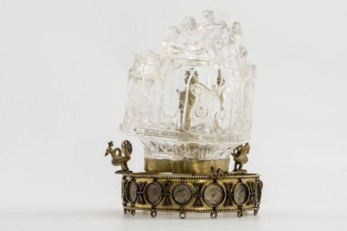 Edicola in cristallo di rocca, monoblocco, montata capovolta. Si presenta in forma di edificio pentagonale a pianta centrale, con tre lati lunghi e due corti. Su uno dei lati lunghi è praticata un'apertura fiancheggiata da due piedritti e coronata da un frontone spezzato. L'interno è liscio e a volta (nella parte attualmente in basso) l'esterno è decorato ad intaglio a rilievo. Il tetto è ornato di intrecci e sottolineato da una banda di scanalature verticali. I due montanti della parete anteriore e la zona centrale di quella posteriore sono ornati di volute, mentre su ognuno degli altri due lati lunghi una spada, uno scudo ed una lancia si alternano a tre pilastri ionici. Sotto l'edificio (oggi nella parte in alto) era stato ricavato un maschio per il fissaggio della montatura, fiancheggiato da due volute sovrapposte con terminazione a traforo