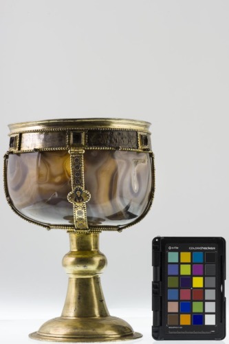 - NOTIZIE STORICO CRITICHE Il piede è un'aggiunta di epoca posteriore. Secondo lo studio di Hahnloser (1971) l'opera fu forse realizzata a Costantinopoli, in considerazione della qualità dell'intaglio della coppa e degli smalti, presumibilmente tra la seconda metà del X e gli inizi dell'XI secolo. Gli anellini erano usati per ulteriori decorazioni pensili andate perdute
