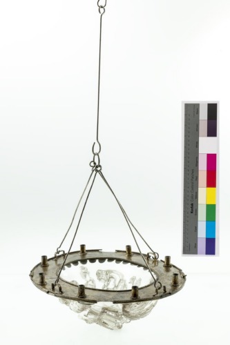 Lampada in cristallo di rocca con cavetto semisferico, decorato con pesci e conchiglie ad intaglio. Una fascia in argento dorato piatta, raccordata alla lampada da una linea di elementi semicircolari, profilata da linee di granuli, rifinisce l'orlo. E' decorata inferiormente da sei grandi paste vitree ovali, contornate da una linea di granuli; superiormente si trovano otto basi cilindriche per candele e quattro anelli per la sospensione