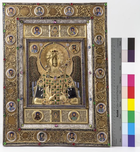 - NOTIZIE STORICO CRITICHE Non è certo che si tratti originariamente di un'icona o piuttosto di una legatura, se pur di un volume di grandi dimensioni. I medaglioni, visibili però solo da vicino, fanno pensare anche ad un'icona ad uso privato. Le due facce comunque appartengono allo stesso oggetto, in considerazione delle dimensioni dell'immagine di San Michele con cornicetta a smalto, che corrispondono a quelle della croce con cornicetta a fiori, e per il fatto che i medaglioni figurati siano di dimensioni analoghe sia davanti che nel retro. L'opera è databile alla fine del X-inizi dell'XI secolo, ma nella parte anteriore subì rilevanti modifiche nel XIX secolo