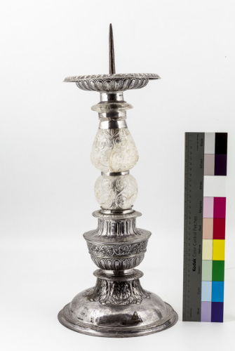 - NOTIZIE STORICO CRITICHE La montatura venne realizzata a Venezia nel Cinquecento utilizzando degli elementi in cristallo di rocca di provenienza orientale di epoca precedente; nel Tesoro vi è un altro candeliere del tutto simile che ne costituisce il pendant
